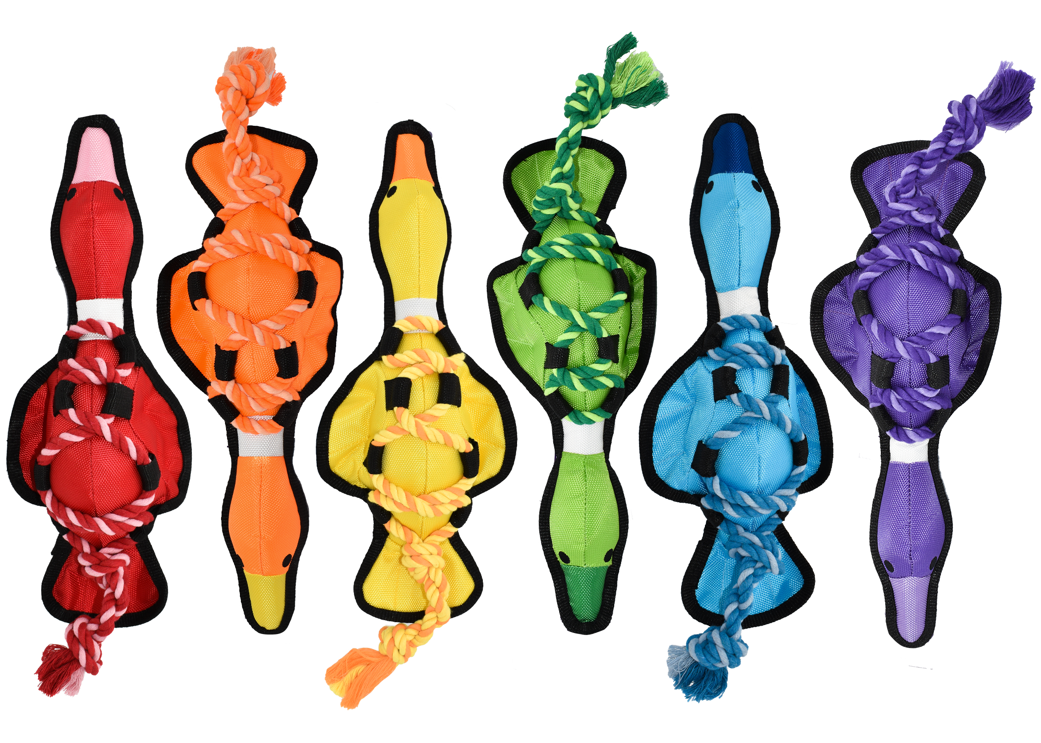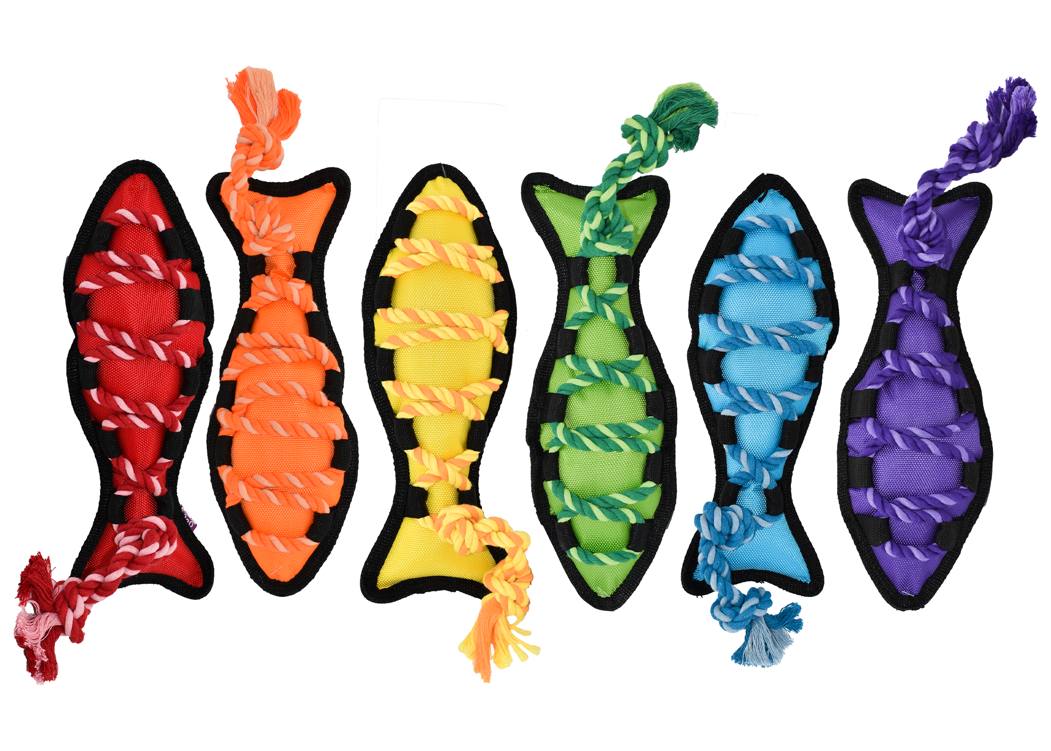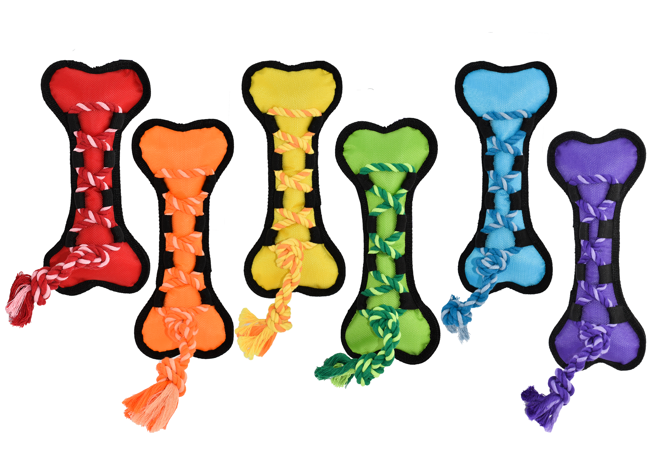 Our unique Cross-Ropes Assortment has a nylon exterior and reinforced seams that make it last against even the toughest chewers. Available in assorted colors and styles (Fish, Bone, and Duck).